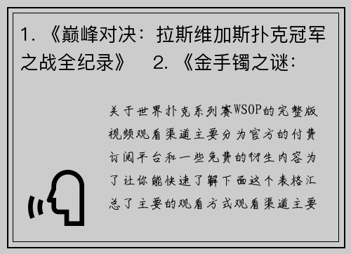 1. 《巅峰对决:拉斯维加斯扑克冠军之战全纪录》 2. 《金手镯之谜:世界扑克大赛终极回合实录》 3. 《豪赌之王:德州扑克主赛事千万奖金争夺战》